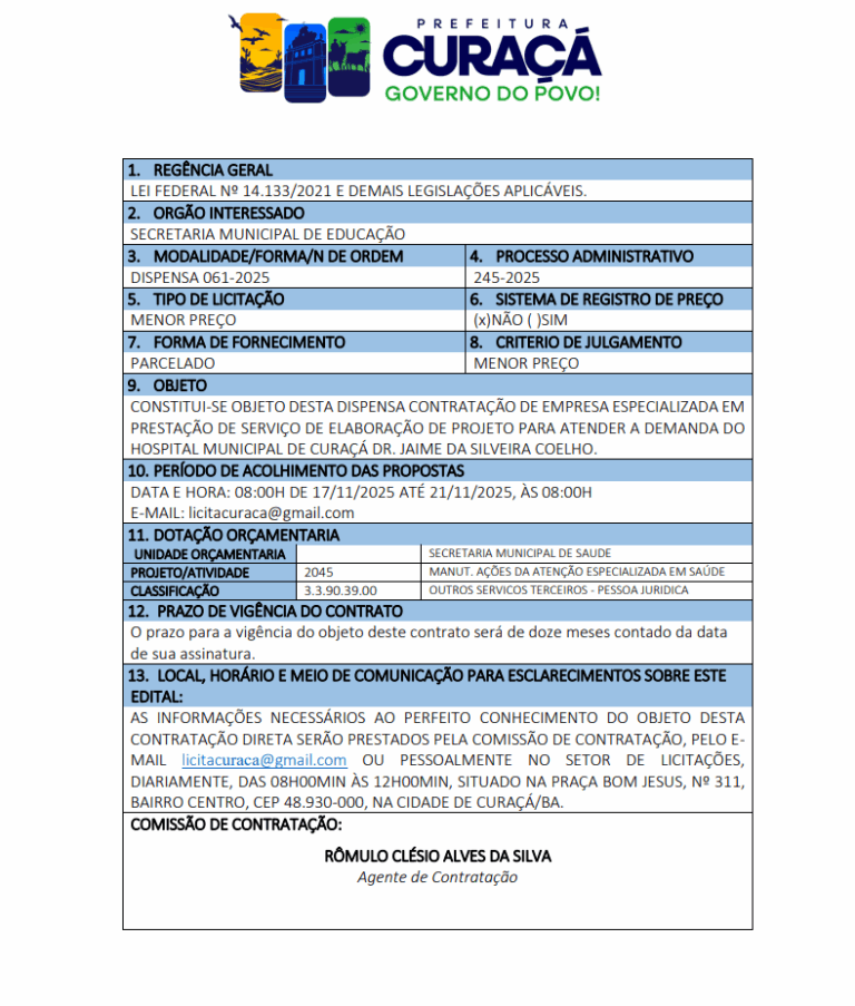 A Prefeitura Municipal de Curaçá, por intermédio da Secretaria de Saúde, informa que deu início ao processo de Dispensa de Licitação Nº 061-2025. O objetivo é a contratação de uma empresa especializada na prestação de serviço de elaboração de projetos de engenharia para atender às demandas do Hospital Municipal de