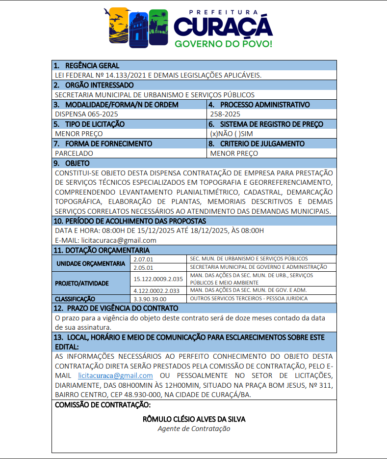 A Prefeitura de Curaçá, por meio da Secretaria Municipal de Urbanismo e Serviços Públicos, torna pública a recepção de propostas referente ao processo de Dispensa de Licitação 065-2025. O objetivo é selecionar a proposta mais vantajosa, utilizando o critério de Menor Preço, para a contratação de serviços técnicos especializados em topografia e georreferenciamento.