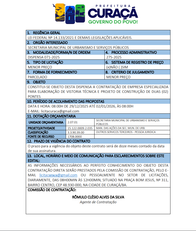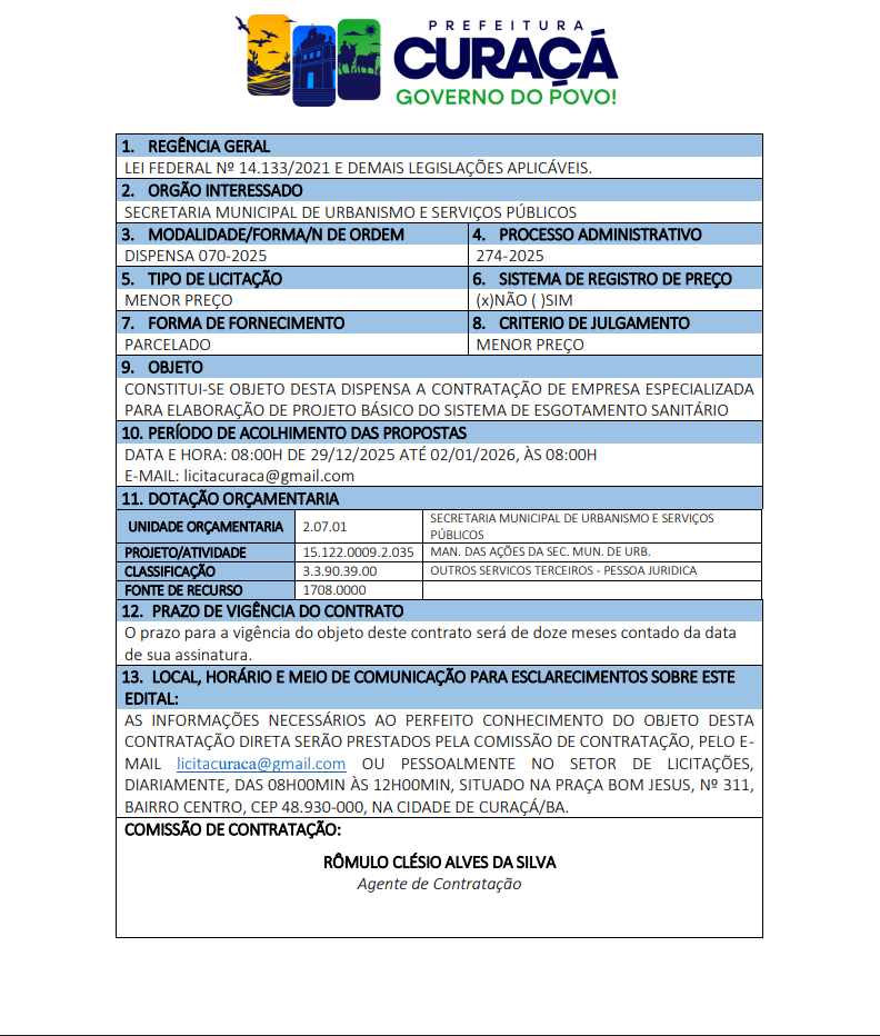 A Prefeitura Municipal de Curaçá, por meio da Secretaria Municipal de Urbanismo e Serviços Públicos, anunciou a abertura do processo de Dispensa de Licitação nº 070-2025 para a contratação de uma empresa especializada na elaboração do projeto básico do Sistema de Esgotamento Sanitário (SES). A iniciativa é considerada fundamental para o desenvolvimento urbano, pois a falta de um projeto adequado representa uma lacuna crítica que compromete a saúde pública e a qualidade de vida dos moradores. O novo sistema visa solucionar deficiências na coleta e tratamento de resíduos, prevenindo a contaminação do solo e de fontes de água potável, além de combater a proliferação de doenças. Compromisso com o Planejamento Urbano Com o crescimento populacional de Curaçá, a gestão municipal busca soluções sustentáveis e eficazes que atendam às necessidades atuais e futuras da comunidade. A elaboração deste projeto técnico permitirá que o município esteja alinhado às políticas públicas de saneamento básico, facilitando a captação de recursos e garantindo a proteção ambiental. Como participar As empresas interessadas em apresentar propostas devem seguir o critério de menor preço. O período de acolhimento das propostas ocorre: O contrato terá vigência de doze meses a partir de sua assinatura. Para mais informações e esclarecimentos sobre o edital, a Comissão de Contratação atende diariamente das 08h às 12h na sede da Prefeitura ou pelo e-mail oficial.