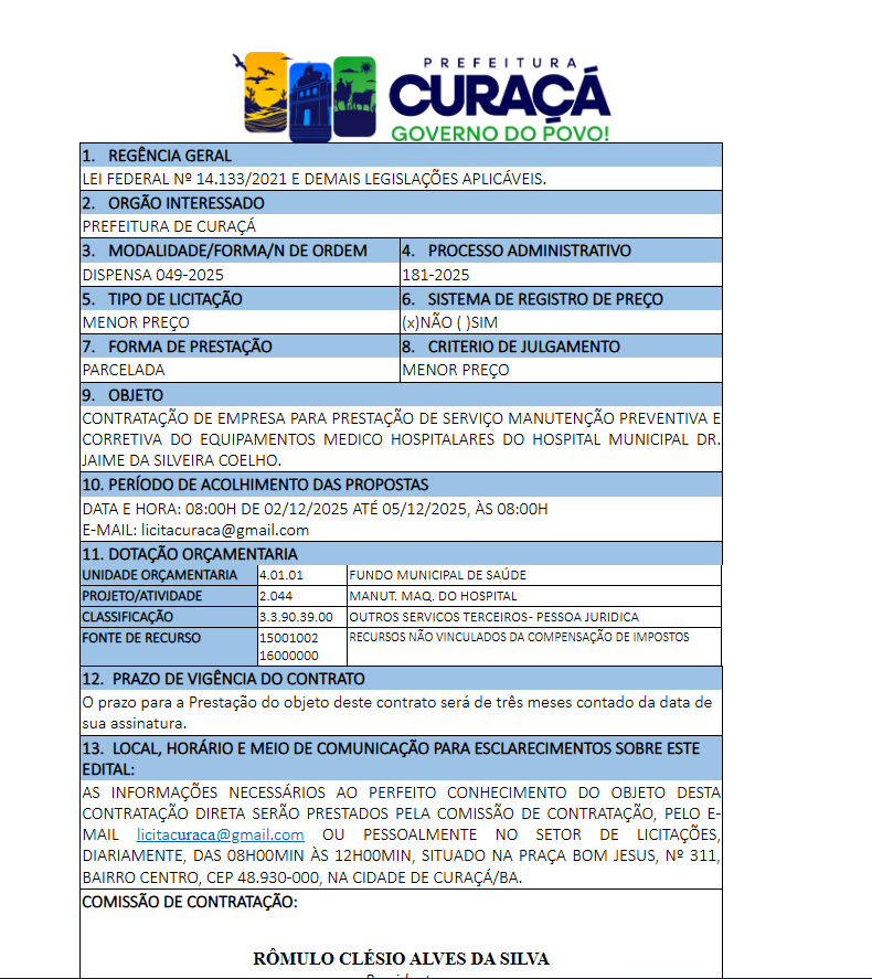 A Prefeitura de Curaçá, por meio da Secretaria de Saúde, tornou público o Processo Administrativo de Dispensa nº 049-2025, que visa a Contratação de empresa para prestação de serviço de manutenção preventiva e corretiva de equipamentos médico-hospitalares. O serviço tem como foco o Hospital Municipal Dr. Jaime da Silveira Coelho. Esta contratação é justificada pela necessidade de gerenciamento da engenharia clínica e busca assegurar a prestação de serviços assistenciais em caráter contínuo, eficiente e objetivando o aumento da capacidade de atendimento.